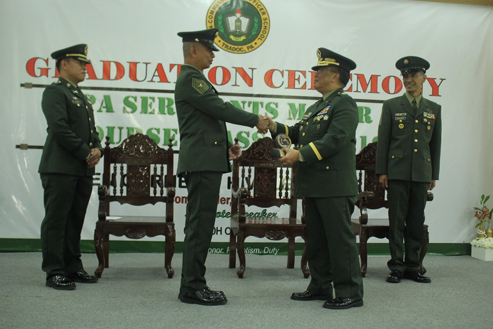 The Non-Commissioned Officer School (NCOS) of the Training and Doctrine Command, Philippine Army conducted the closing ceremony for Sergeant Major Class 01-2019 last 04 October 2019 at Officer Candidate School. TRADOC Commander Major General Cornelio H Valencia Jr graced the closing ceremony as the Keynote Speaker. On his speech he congratulated the graduates and reminded them to inspire soldier and officers and bring excellence to their respective units.