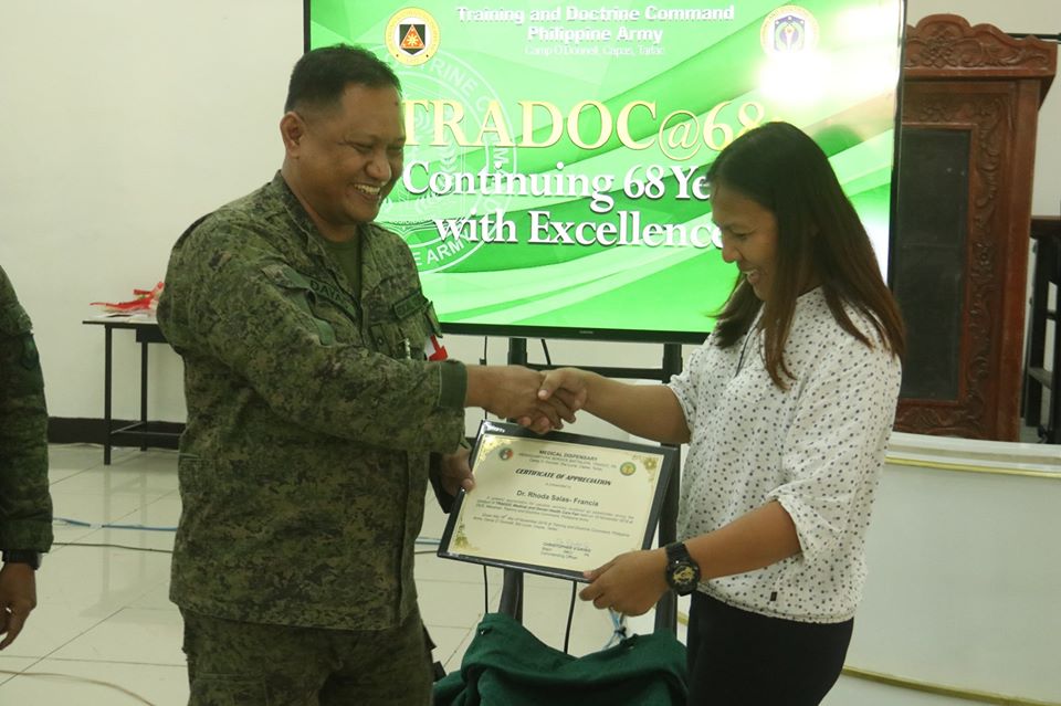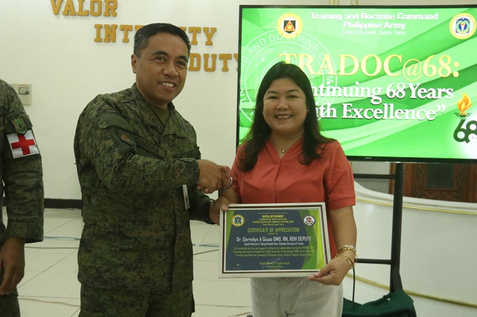 Training and Doctrine Command, Philippine Army conducted Health Care Fair to all organic personnel and students in connection to the 68th anniversary of the Command. The health care includes free uric, sugar and HIV test, bone screening, anti-rabies vaccination and deworming of animals and conducted lectures on Dengue and HIV awareness and dental care.