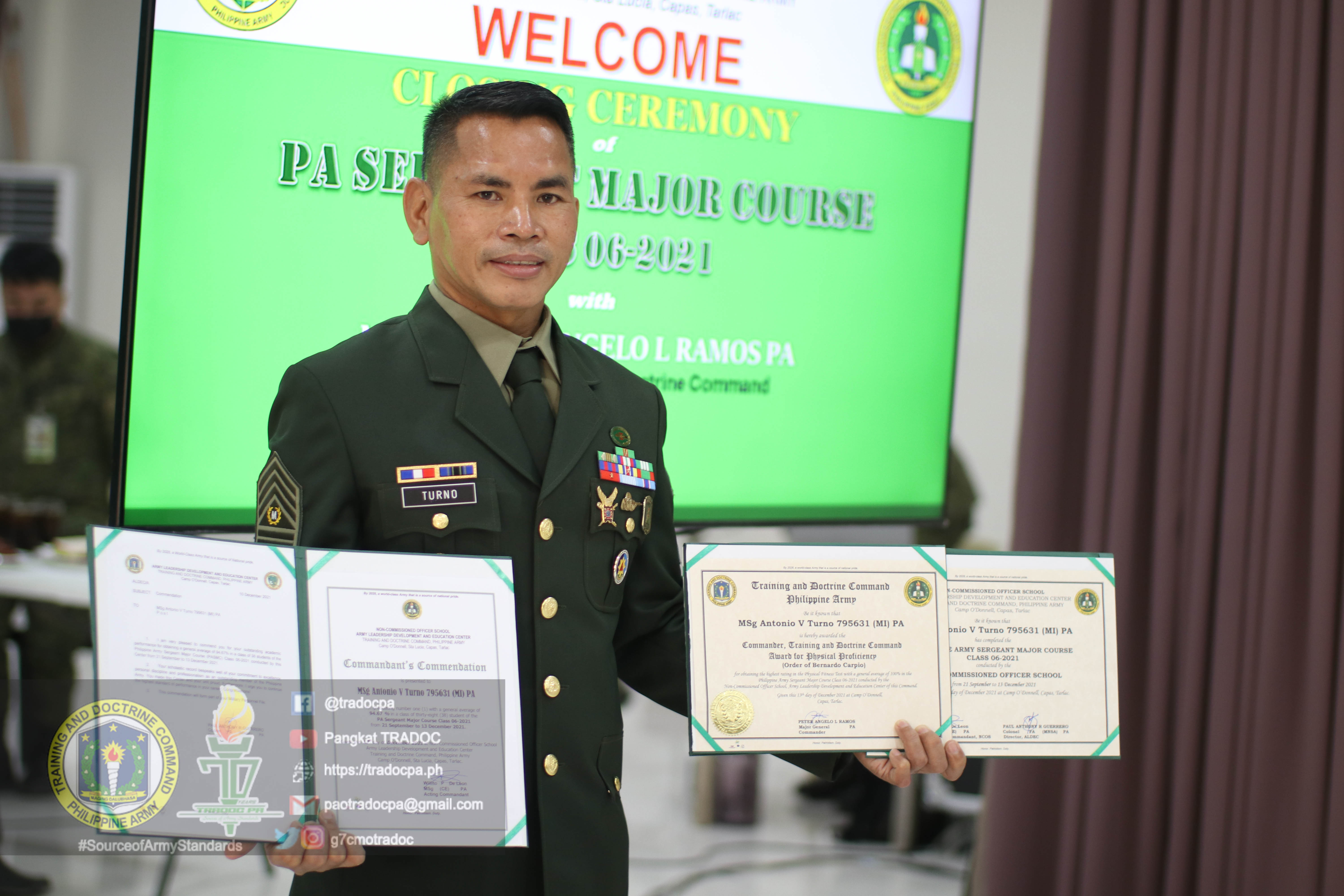 Camp O’Donnell, Capas, Tarlac – The Philippine Army Sergeant Major Course Class 06-2021 "MAALAB" culminates on 13 December 2021, with 38 senior Non-Commissioned Officers from the different Philippine Army Major Units. Topping the class is MSg Antonio V Turno (MI) PA of AFP Education Training and Doctrine Command (AFPETDC).